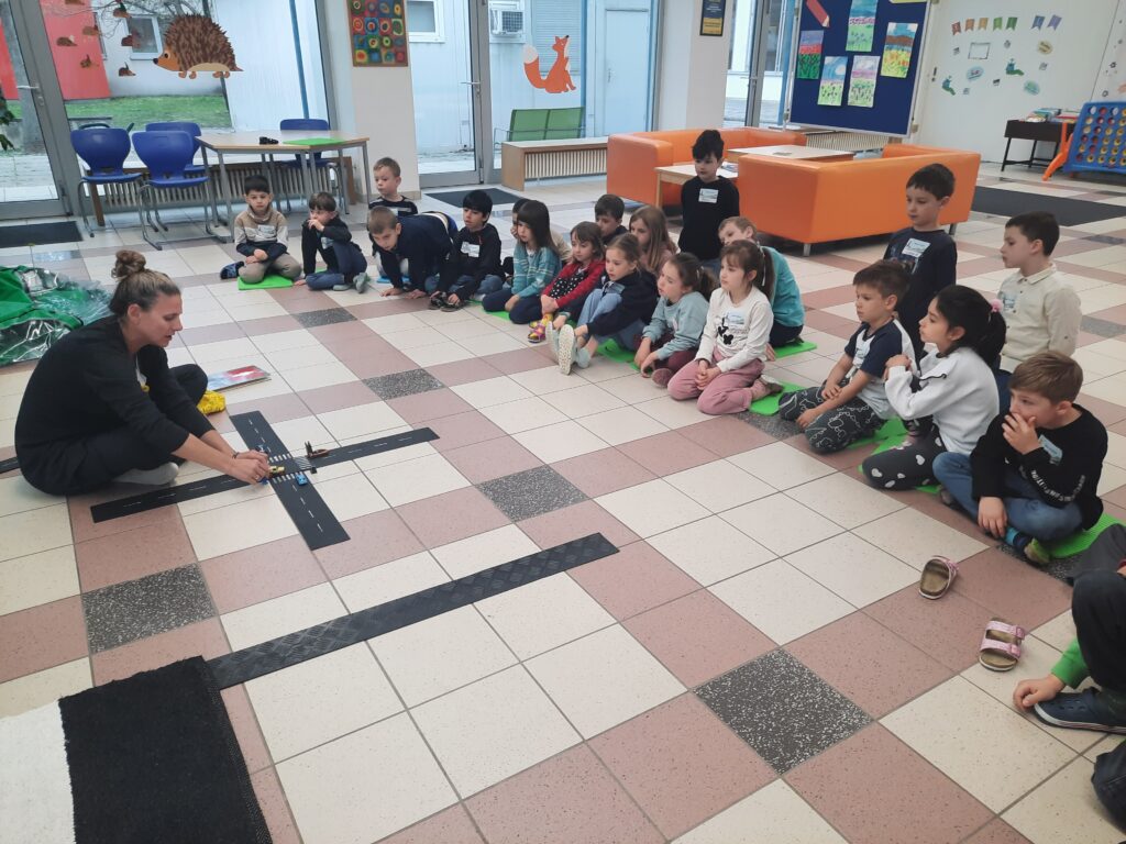 Verkehrsegeln zum sicheren Überqueren einer Straße werden mit Spielautos und Spielfiguren spielerisch besprochen. Anschließend werden die erlernten Tipps praktisch auf einem Teppich-Zebrastreifen angewandt.