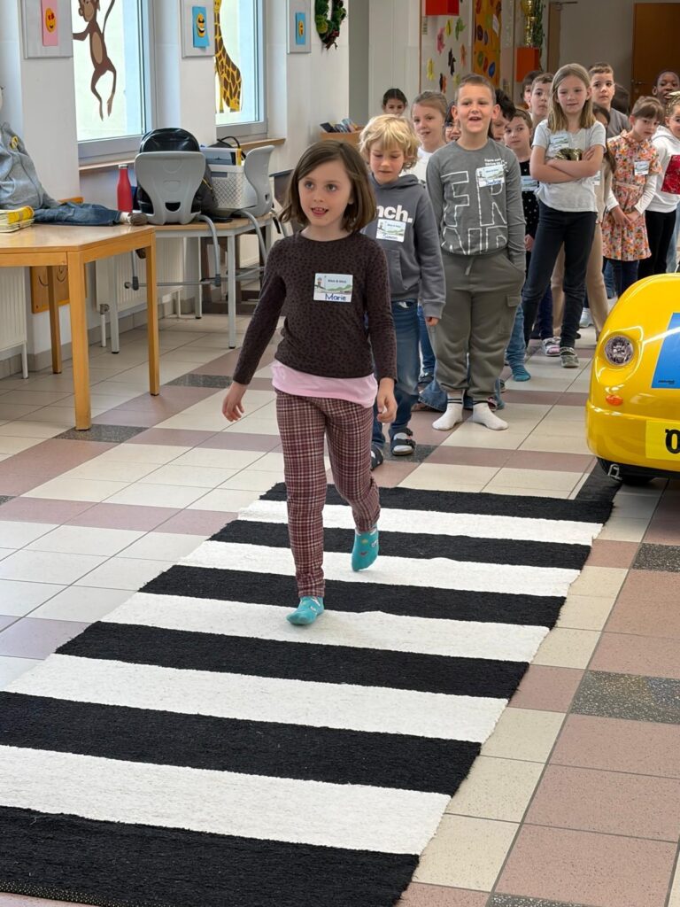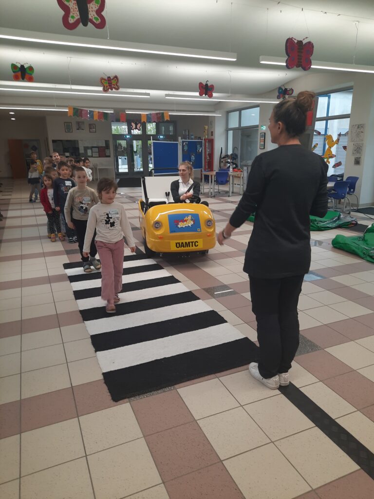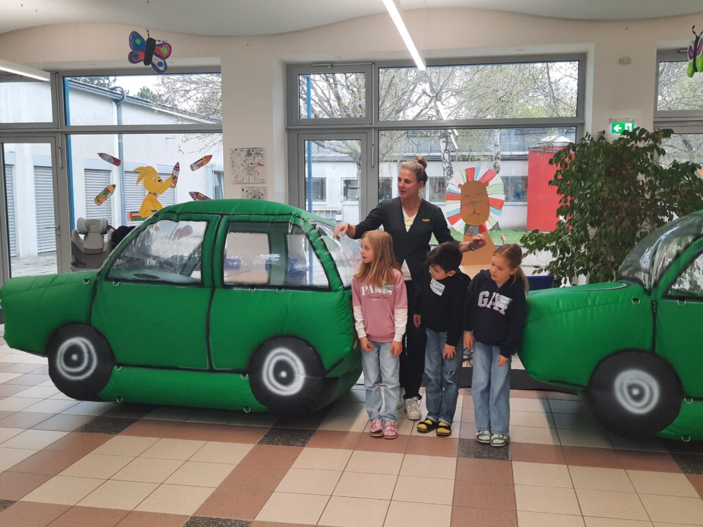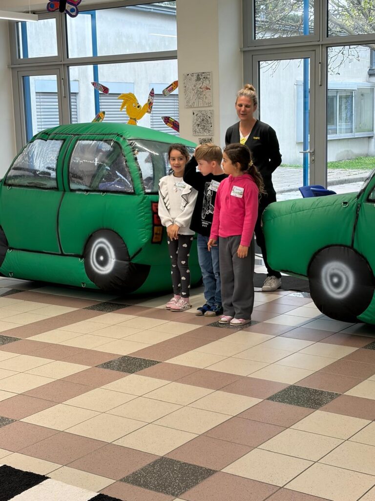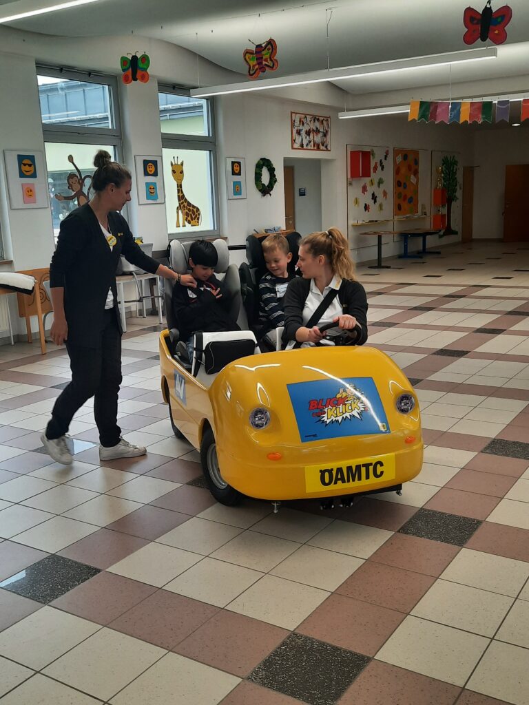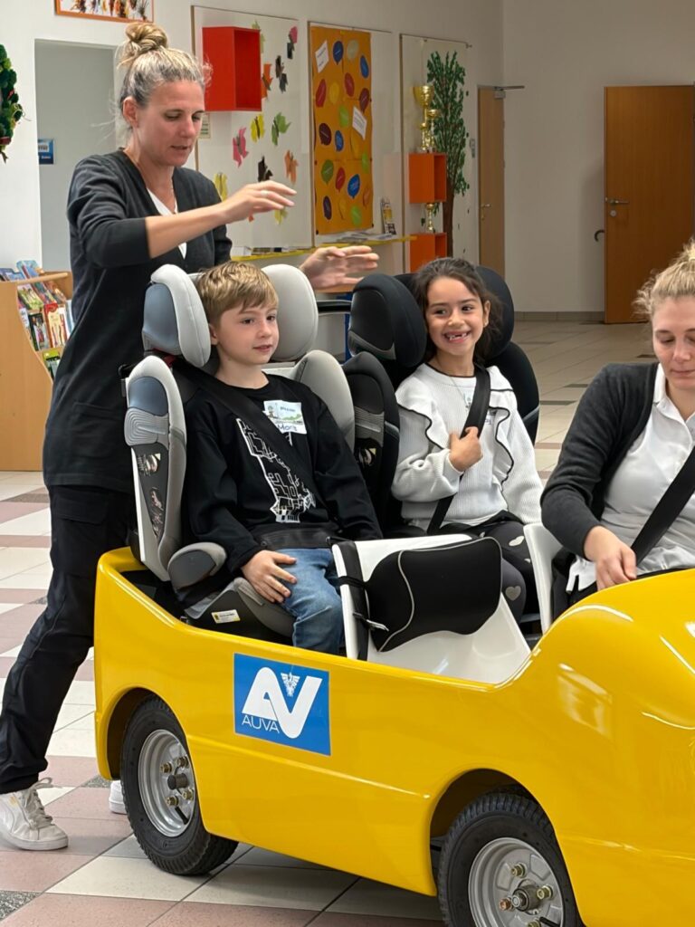 Zum Abschluss – und natürlich das Highlight für die Kinder – dürfen die Kinder in einem speziell angefertigten Elektroauto mitfahren und lernen dabei das richtige Anschnallen im Kindersitz.